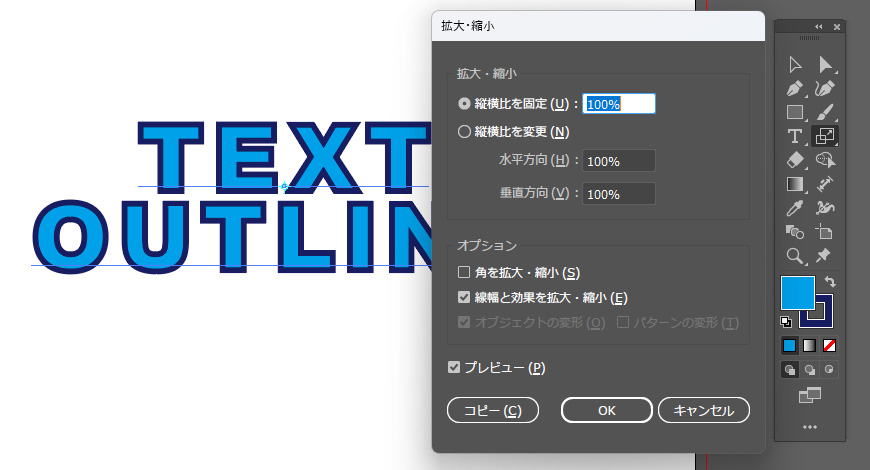 拡大・縮小したい対象のオブジェクトを選択。 「拡大・縮小ツール」をダブルクリックしてダイアログボックスを表示。