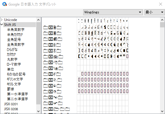 「Google日本語入力」の場合、文字パレットを開いてWindingsフォントを選択すると表示が乱れてしまいます。