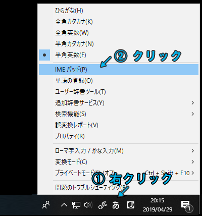 手順1:Windowsの画面左下、「あ」の表示のあるところで、マウスを右クリックします。
